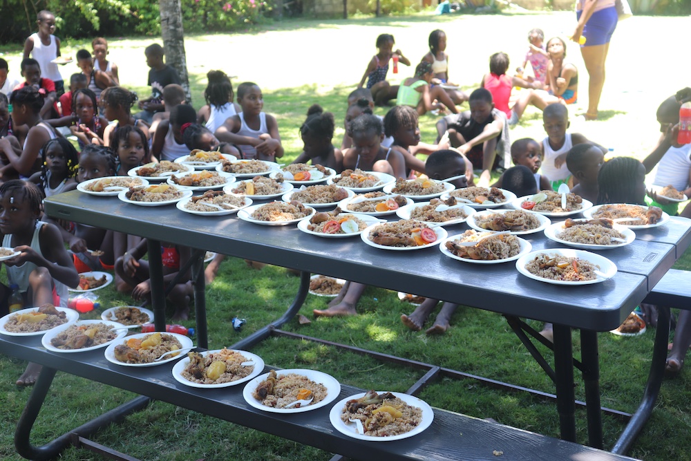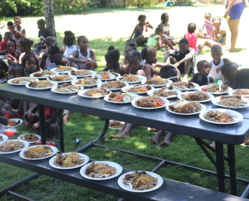 Le menu du jour ? Riz national, poulet bien doré et jus sexy bien frais (et non, ce n’est pas une blague, c’est le nom du jus préféré des enfants du CDAM… au goût exotique et sucré juste comme il faut !).