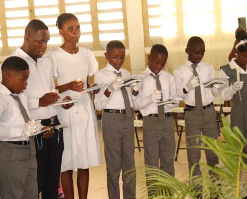 En ce dimanche 29 juin 2025, alors que l’Église universelle fêtait la Solennité de Saint Pierre et Saint Paul, Apôtres courageux et piliers de notre foi, le Centre Diocésain des Arts et Métiers (CDAM) vibrait d’une joie toute particulière : 17 jeunes filles et garçons, venus de l’EFOGIMO (1ère à 6e A.F.) et du Centre de Formation Professionnelle (CFP), ont communié pour la toute première fois au Corps et au Sang du Christ.
